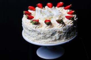 A delicate vanilla sponge layered with fresh Chantilly cream and strawberry pulp, finished with hand shaven white chocolate and fresh seasonal strawberries.