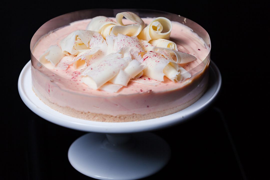 An amazing combination of our creamy vanilla cheesecake, bound with white chocolate ganache and real raspberries. Garnished with hand shaven white chocolate and sprinkled with raspberry powder for that extra bite.