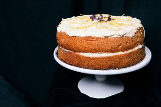 Moist, vanilla cake made with softened threaded coconut, cut through the center and lavished with our home-made lemon syrup, cream cheese icing and lemon curd filling. Topped with more cream cheese icing, fresh lemon zest and to garnish - a hand-picked edible flower from our in-store garden.